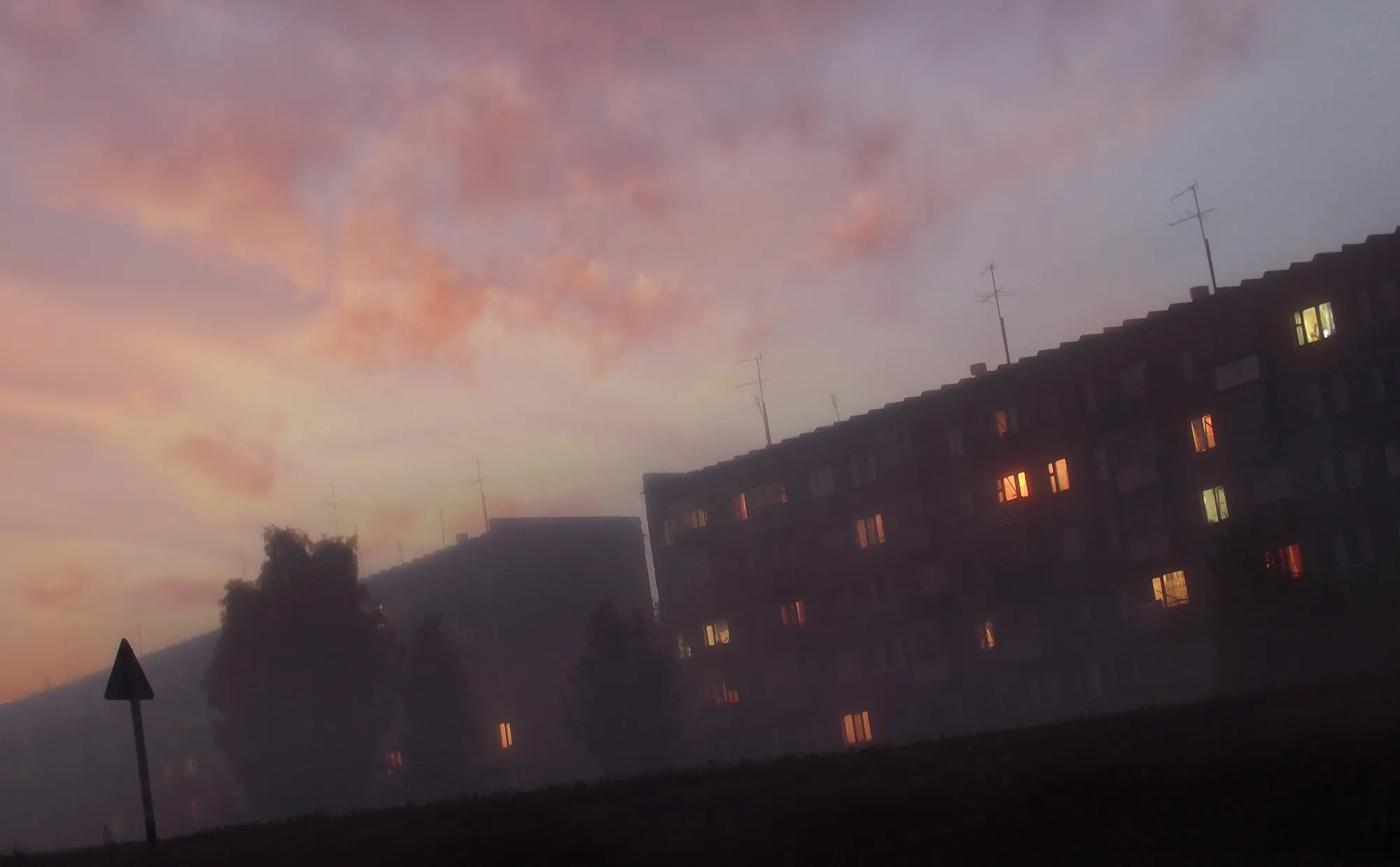 Какие-то желтые цветы возле гниющего во дворе матраса. Однако детали настолько потеряны, что они превратились в с трудом отличимые белые пятна.