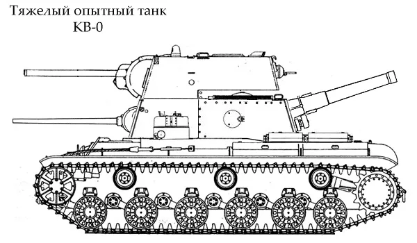 Тяжёлый опытный танк КВ-0. Прототип, разрабатываемый в секретных условиях НИИ Танкостроения. Помимо традиционной 76-мм пушки должен был оснащаться вспомогательным вооружением во лбу, а также гаубицей в корме. Последняя должна была по задумке инженеров превращать танк в подвижную артиллерийскую установку, повышая функциональность танка. При этом, с учётом бронирования техники, при развороте машины её общая защищённость не должна была падать, таким образом в любой ситуации танк мог наступать в двух направлениях по выбору экипажа.