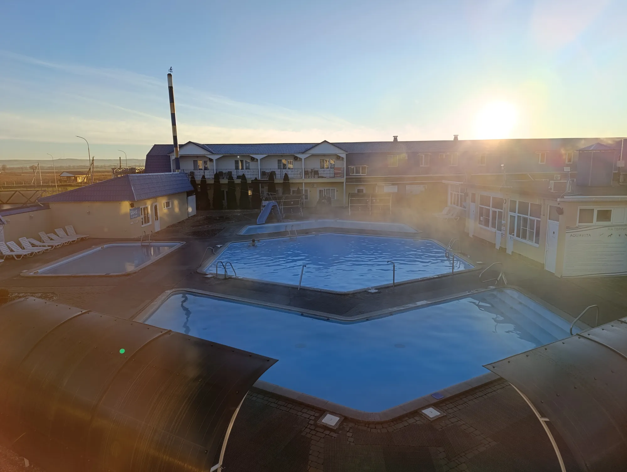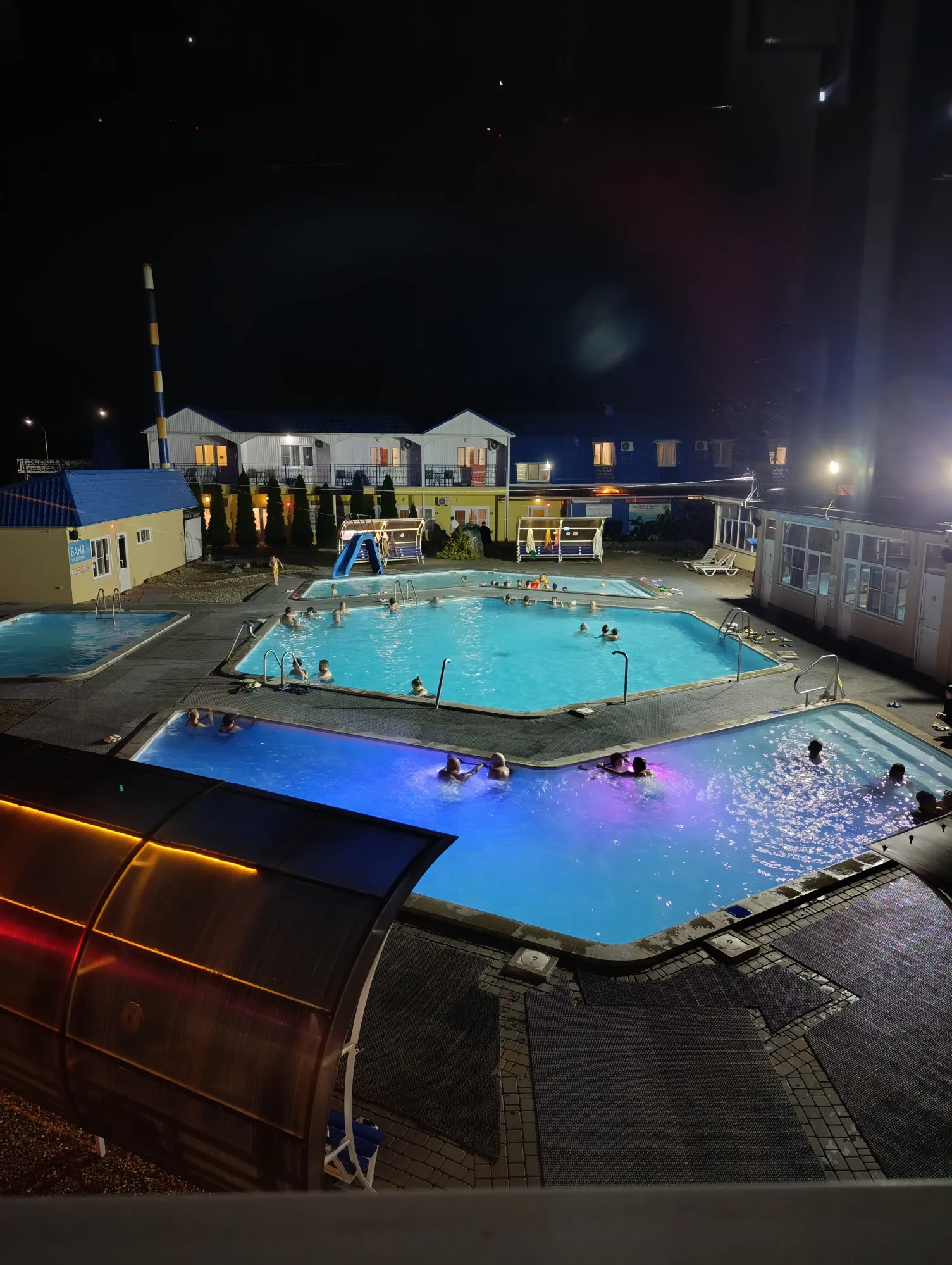 Вода подается в бассейны со скважины глубиной 1885 метров, охлаждаясь до комфортной температуры)))