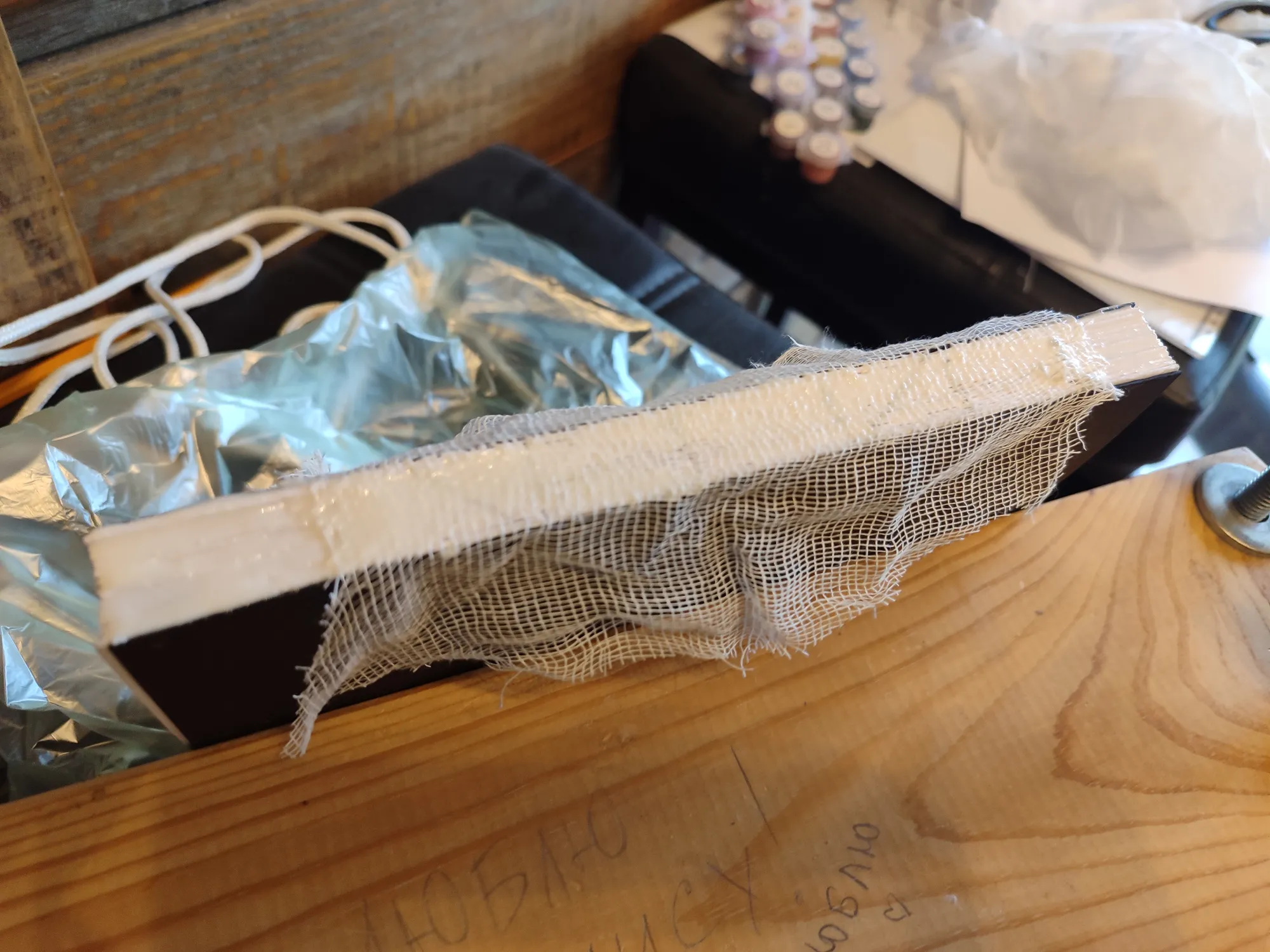 Дальше приклеиваю тряпочку к сформированному блоку. Не знаю, что это: хлопок или лён - я в этих штуках не разбираюсь, но тряпочка хорошая, прочная, не первый раз использую для проклеивания.