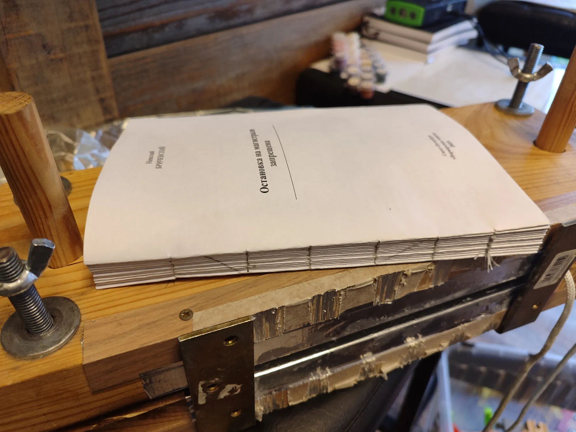 Теперь нам надо это сшить, но просто так сшить не получится. Сначала надо бумагу сжать хорошенько прессом и оставить там на пару-тройку часов. Раньше я использовал в качестве пресса две толстых доски и стягивал их струбцинами. Самое главное, чтоб доски были ровными. Идеально: ламинированная фанера двадцатка.
