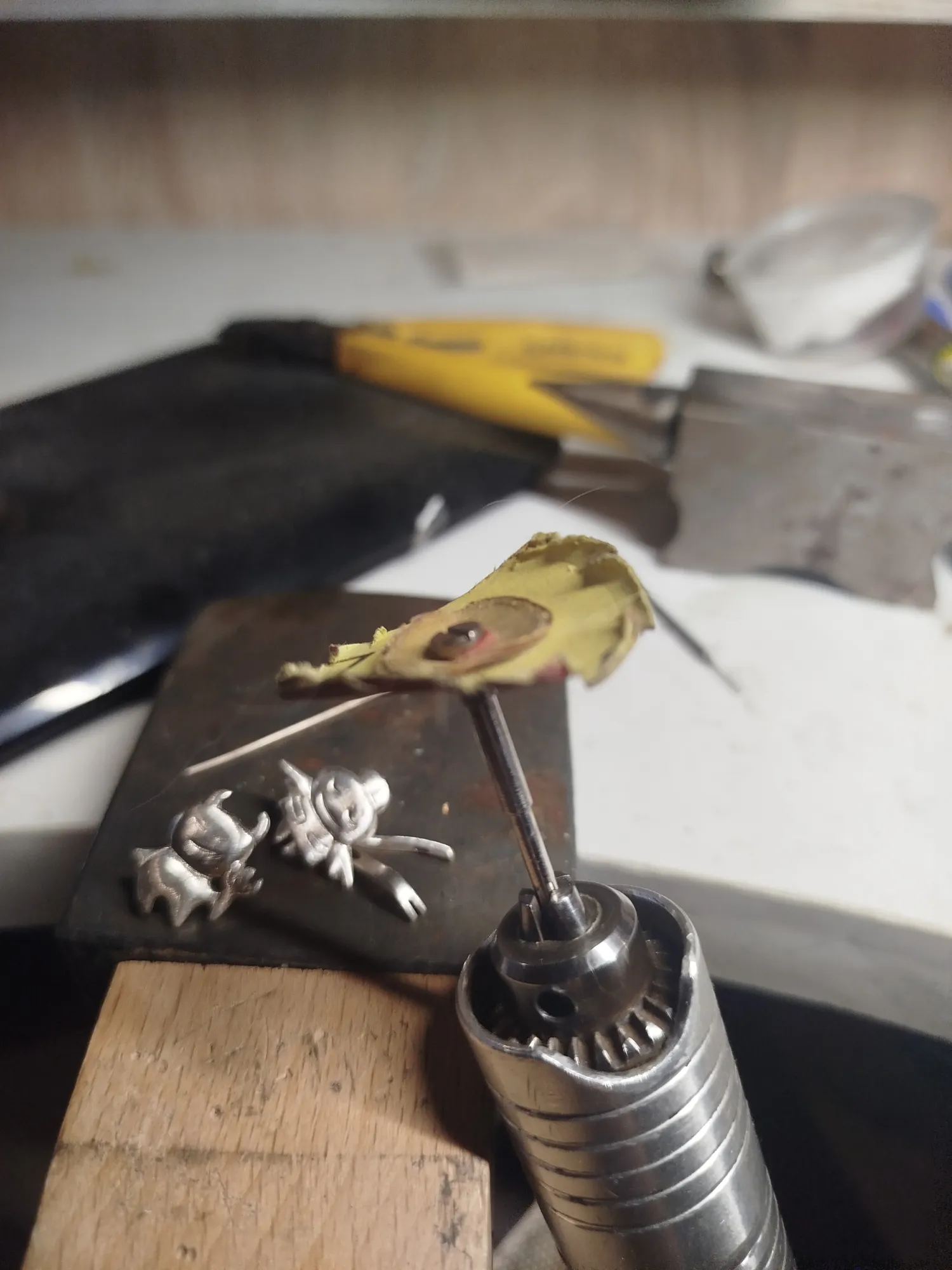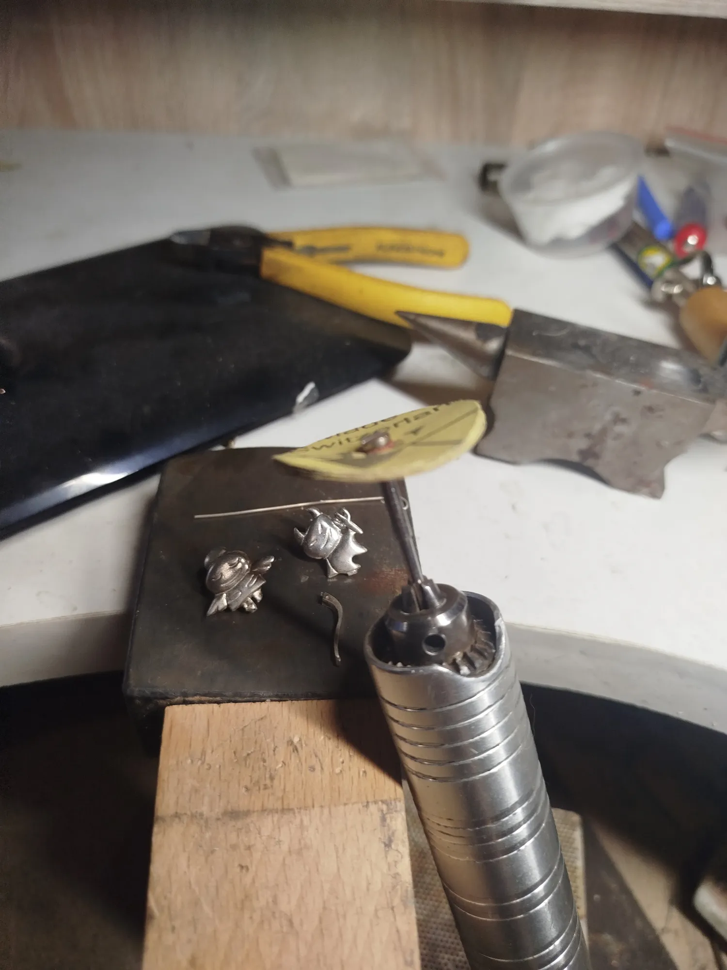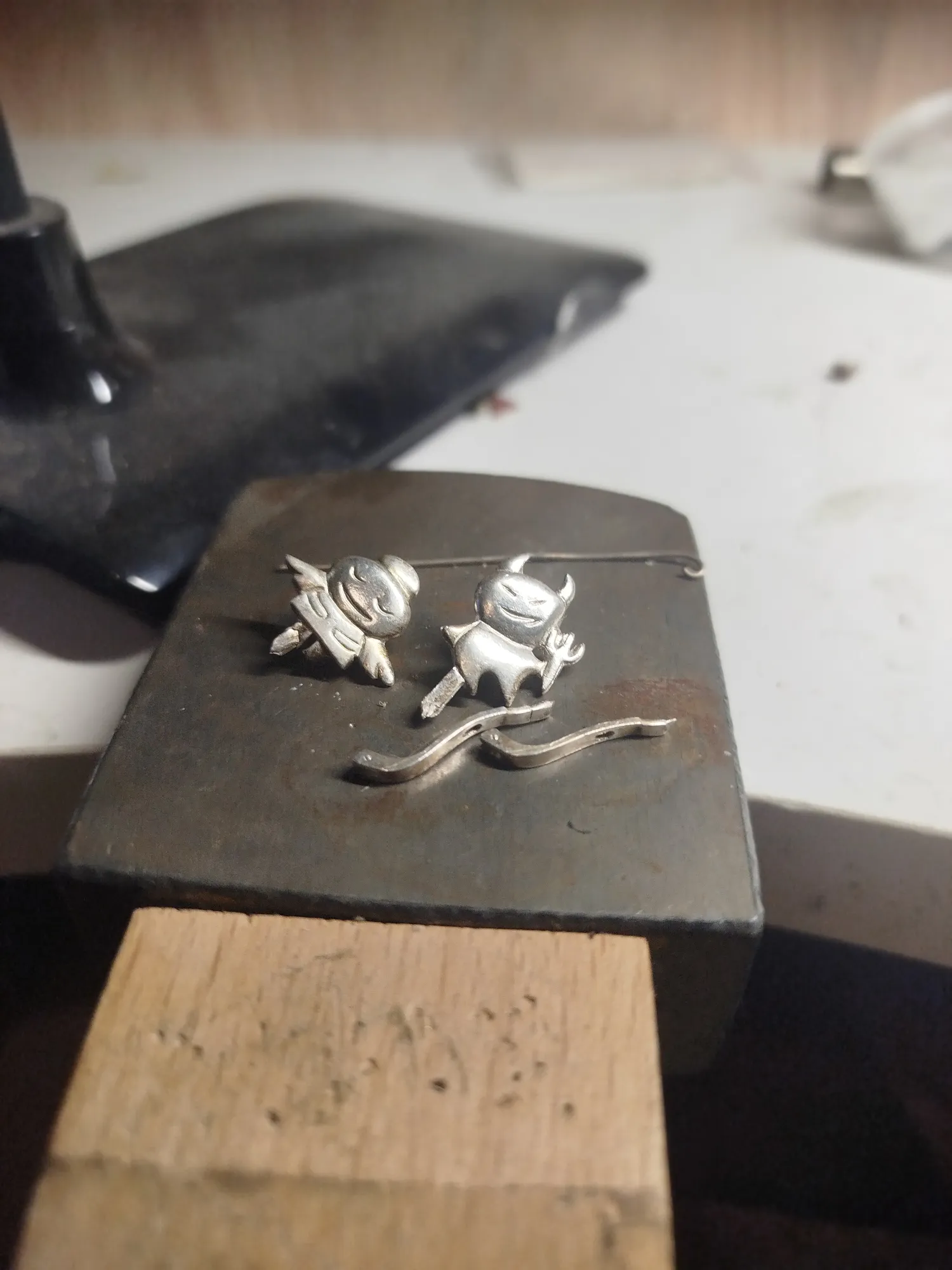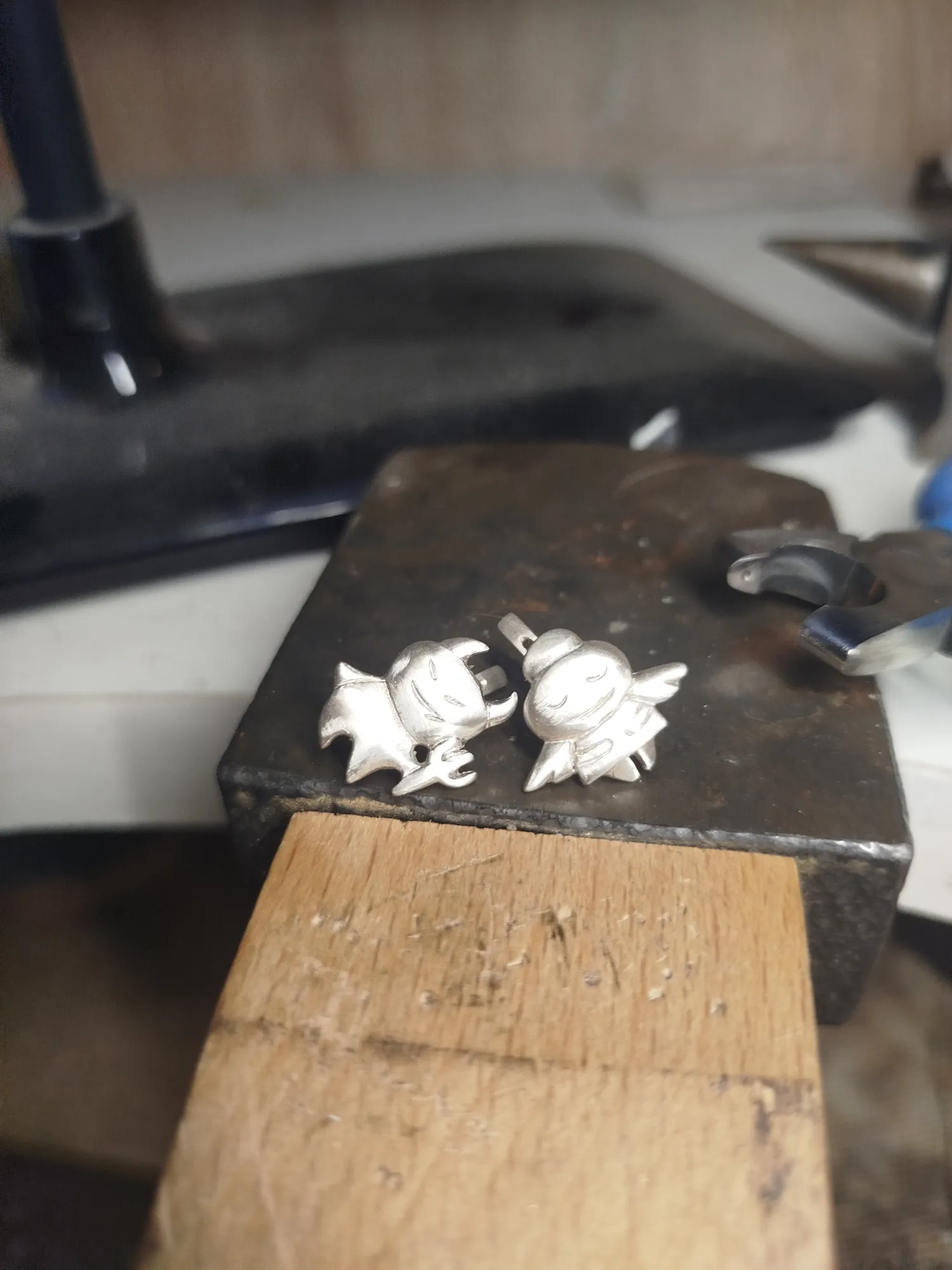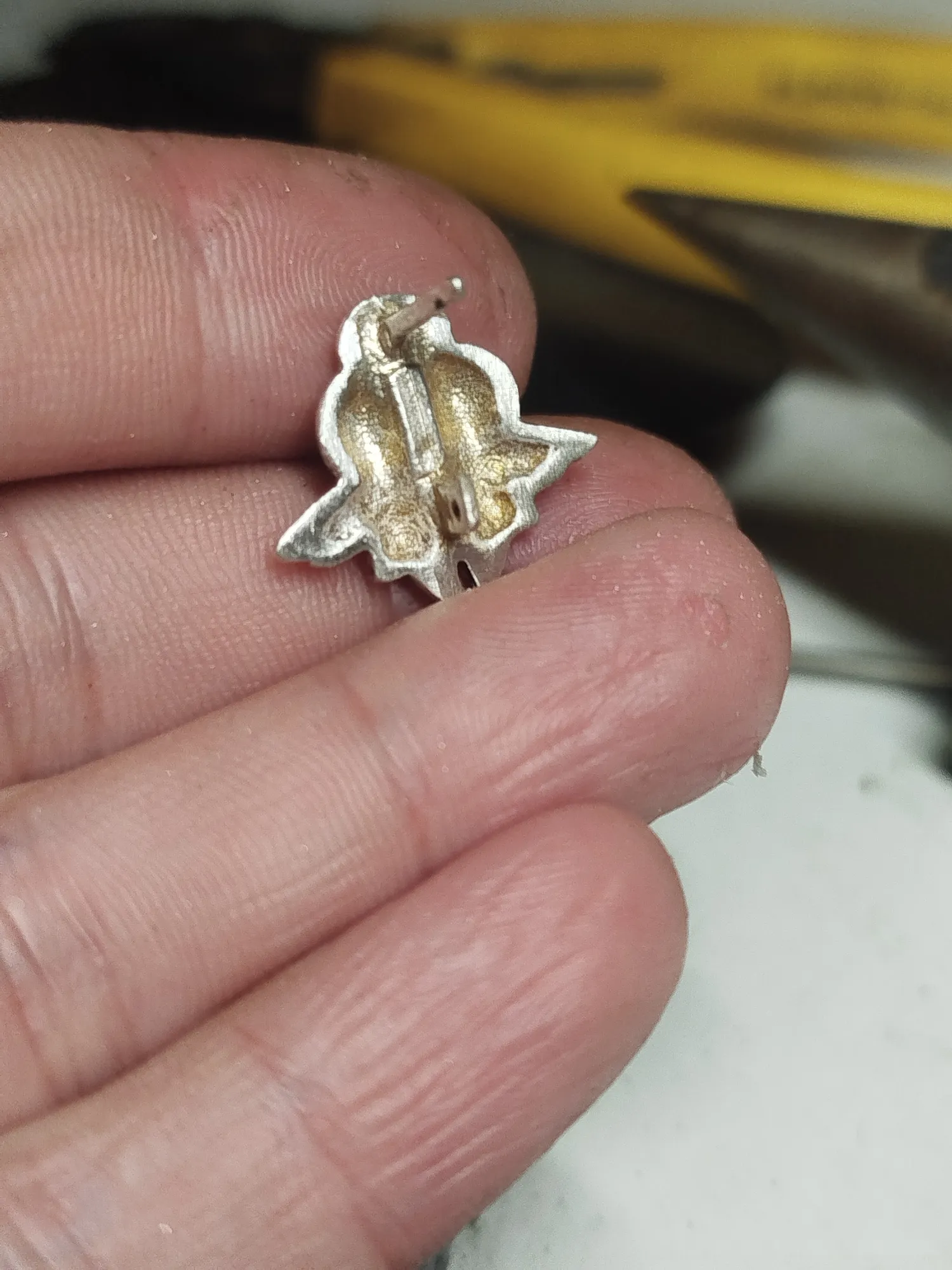 На этом этапе важно не потерять плоскость и выставить геометрию, а она та еще беспощадная сука. Кроме литников обрабатываем грубо серьги с лица и по контуру, проходим изнанку, особенно штырек и флажок: