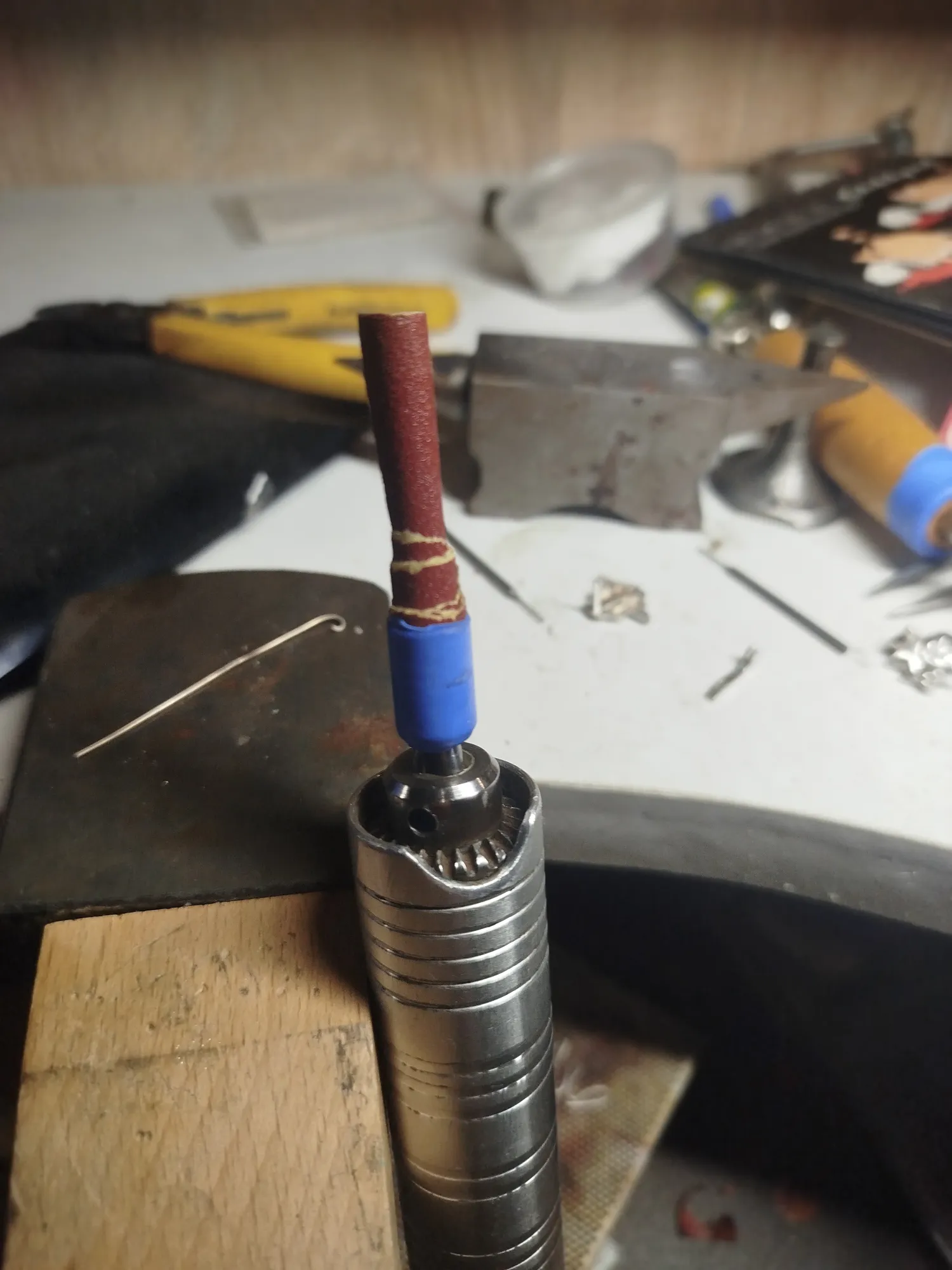 Оставляем по 0,5 мм примерно с каждого конца и заплющиваем их специальной приблудой- штифтовкой (на заднем плане):