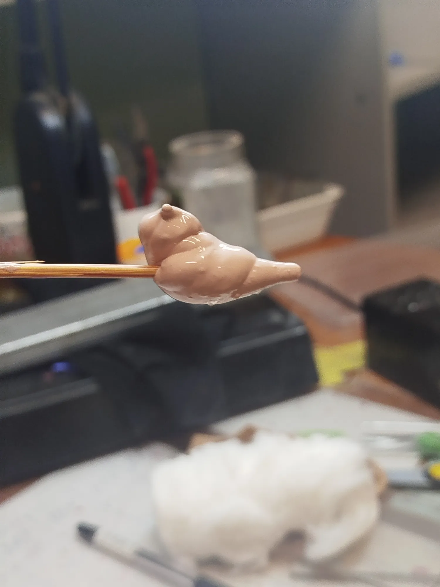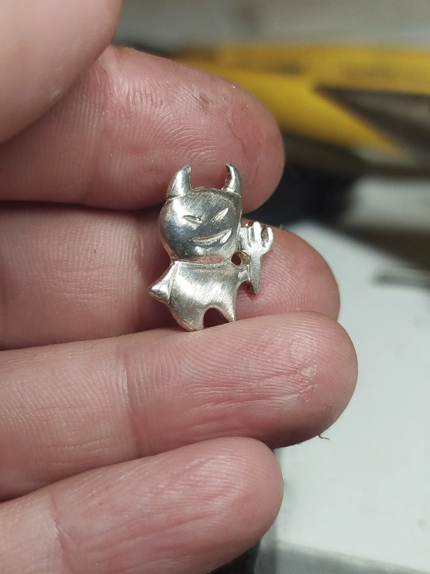 Вот там сверху между рогами виден шов- это облой, его убираем как раз бором конусом. Со второй серьгой поступаем точно также.