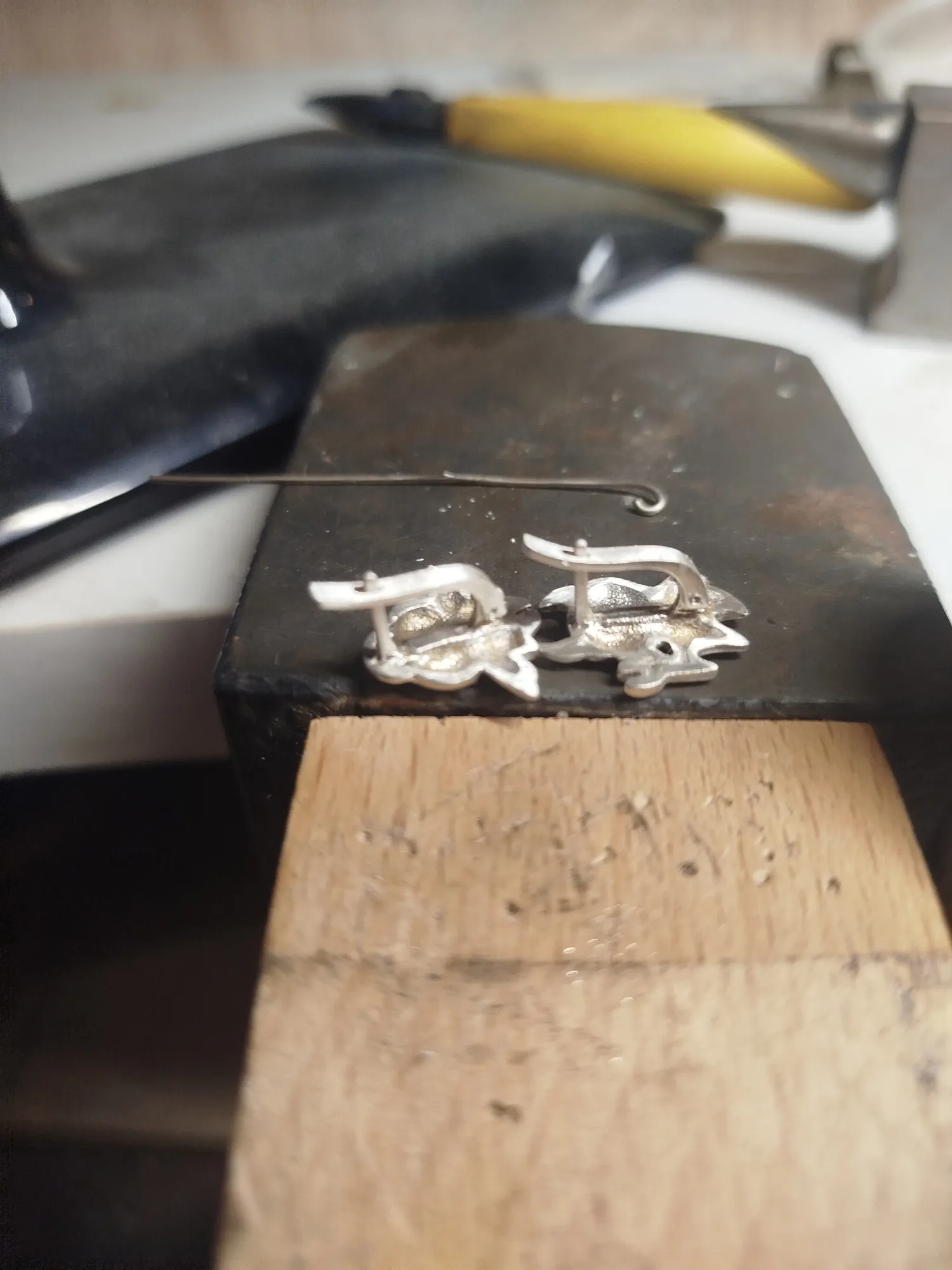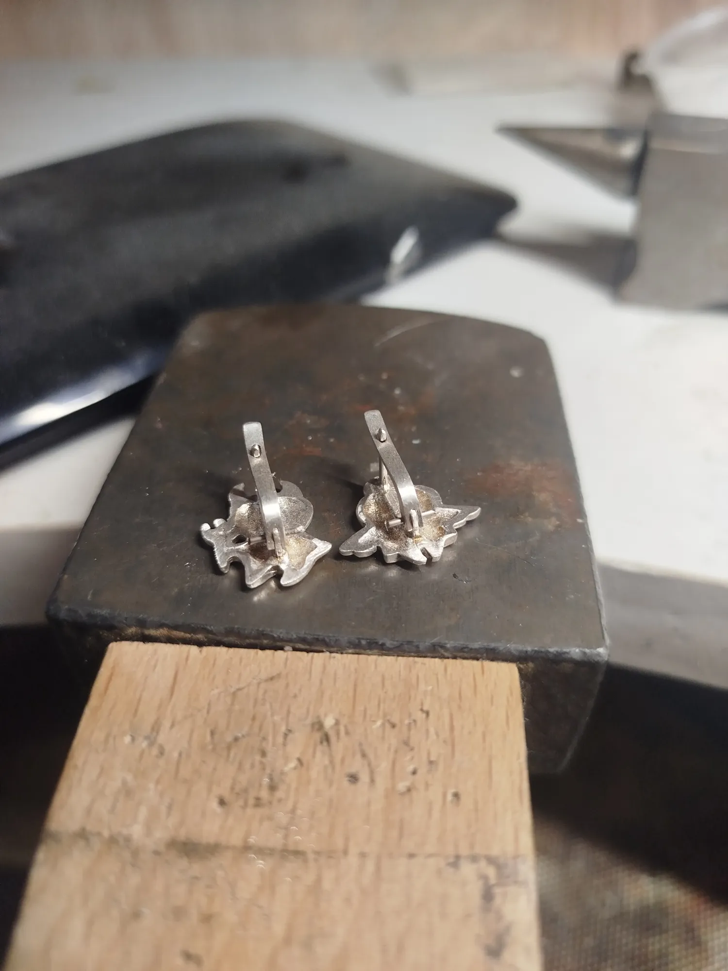 Утречка. Нашла у себя в столе давно отлитые серьги (надо еще поискать, заодно и уборку сделаю), почему бы их не собрать, а заодно и вам показать как оно делается? На больших заводах и производствах делают что по серебру, что по золоту точно также- разве что без чернения. Итак, поехали!