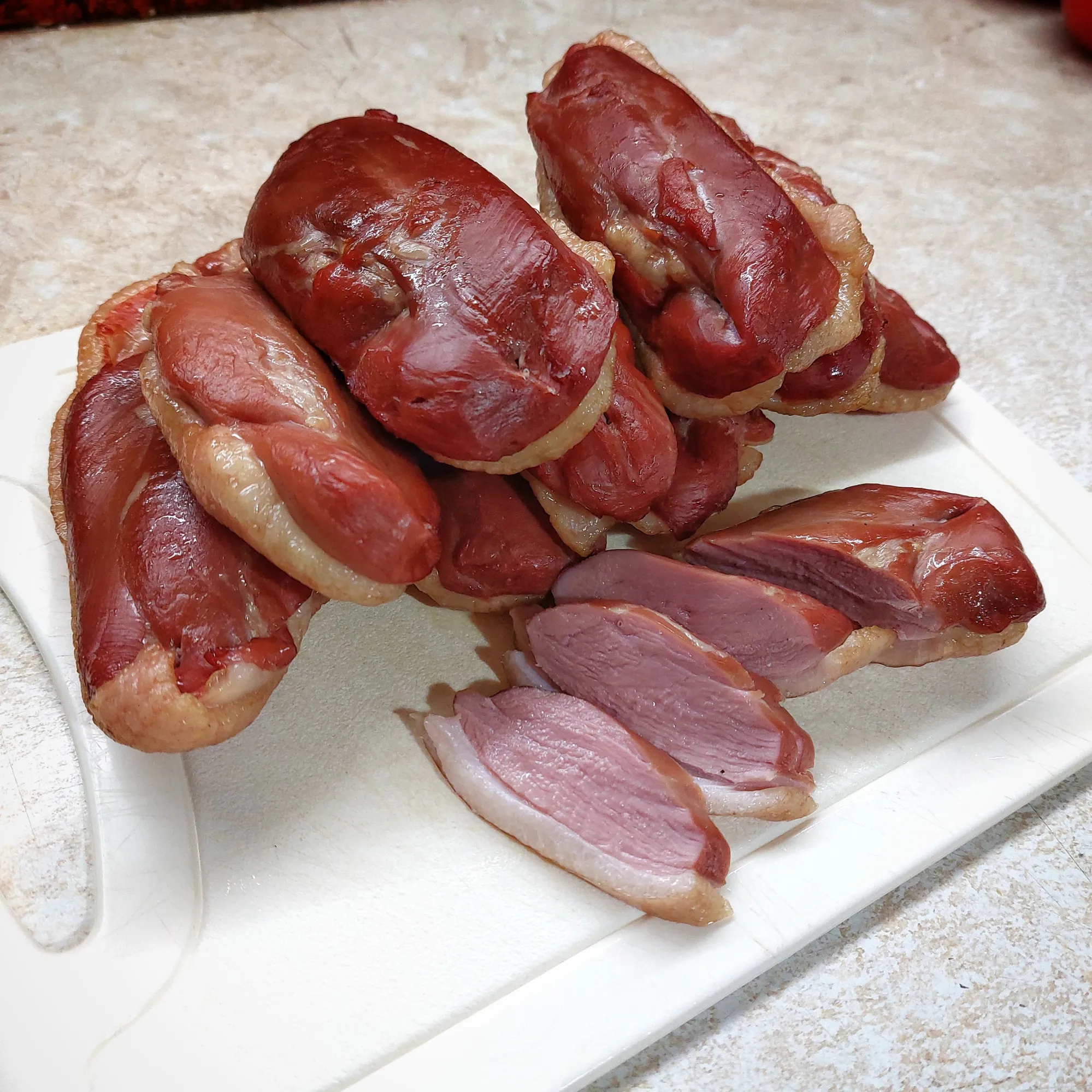 Что-то бутербродить нечем стало. Накоптил утиных грудок немного. Нарезаем как нравится, мажем на хлеб немного горчицы, сверху мясо и листик петрушки. Возможны варианты :)