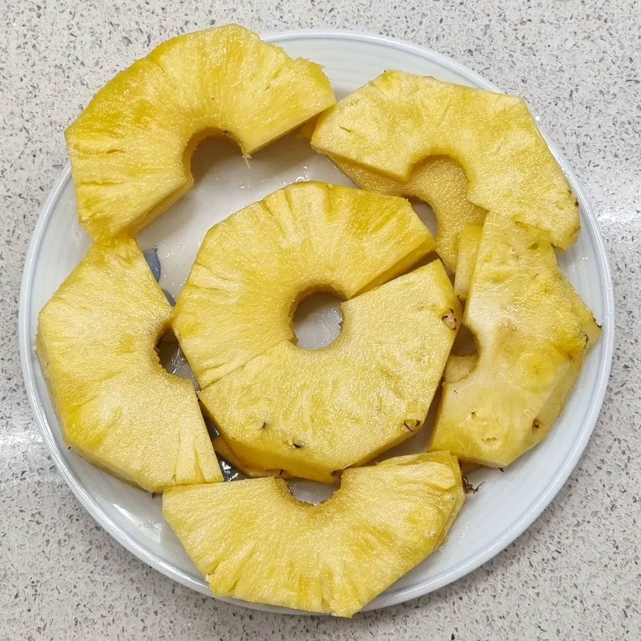Чистить ананасы я не умею, так что просто отчикала ему листья и донышко и срезала бока. И ножом для удаления сердцевины яблока вырезала серединку. Кстати, тот, что мне принесли в прошлый раз попробовать, был в 1,5 раза меньше, и у него даже сердцевинка была нежная и сладкая.