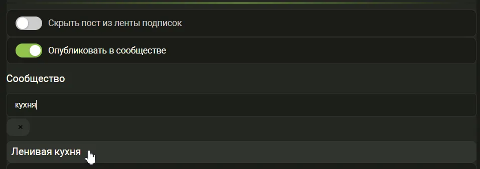 Пользователь, желающий разместить пост в таком сообществе, может выбрать его при создании записи: достаточно переключить тумблер «Опубликовать в сообществе» и начать вводить его название.